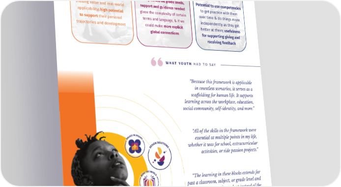 YOUTH VOICES Loved Questioned Saw Consistent connection to Utility across all grade levels, Potential to use competencies lifelong value and real-world support and guidance needed to get practice with them applicability; high potential given the complexity of certain over time & do things more to support their personal terms and language, & if we independently as they get trajectories and development could make more explicit better at them; usefulness global connections for supporting giving and receiving feedback WHAT YOUTH HAD TO SAY “Because this framework is applicable in countless scenarios, it serves as a sca昀昀olding for human life. It supports learning across the workplace, education, social community, self-identity, and more.” “All of the skills in the framework were essential at multiple points in my life, whether it was for school, extracurricular activities, or side passion projects.” “The learning in these blocks extends far past a classroom, subject, or grade level and instead focus on the student instead of the grades. It connects in classroom skills and rubrics to out of classroom independent study and ties in real world skills to make a better citizen of the earth. ” 12
