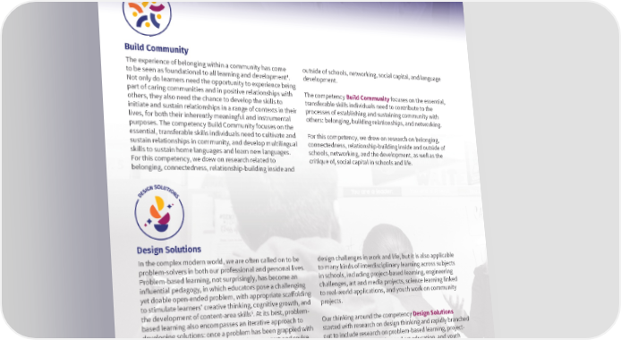 Research Overview he research consulted in designing each of the Future9 Competencies is briefly summarized here. We outline the by Competency Tthinking, selection, development, and focus of individual competencies as part of a set of essential skills for future-ready learning. Build Community The experience of belonging within a community has come outside of schools, networking, social capital, and language 4 to be seen as foundational to all learning and development . development. Not only do learners need the opportunity to experience being part of caring communities and in positive relationships with The competency Build Community focuses on the essential, others, they also need the chance to develop the skills to transferable skills individuals need to contribute to the initiate and sustain relationships in a range of contexts in their processes of establishing and sustaining community with lives, for both their inherently meaningful and instrumental others: belonging, building relationships, and networking. purposes. The competency Build Community focuses on the essential, transferable skills individuals need to cultivate and For this competency, we drew on research on belonging, sustain relationships in community, and develop multilingual connectedness, relationship-building inside and outside of skills to sustain home languages and learn new languages. schools, networking, and the development, as well as the For this competency, we drew on research related to critique of, social capital in schools and life. belonging, connectedness, relationship-building inside and Design Solutions In the complex modern world, we are o昀琀en called on to be design challenges in work and life, but it is also applicable problem-solvers in both our professional and personal lives. to many kinds of interdisciplinary learning across subjects Problem-based learning, not surprisingly, has become an in schools, including project-based learning, engineering influential pedagogy, in which educators pose a challenging challenges, art and media projects, science learning linked yet doable open-ended problem, with appropriate sca昀昀olding to real-world applications, and youth work on community to stimulate learners’ creative thinking, cognitive growth, and projects. 5 the development of content-area skills . At its best, problem- based learning also encompasses an iterative approach to Our thinking around the competency Design Solutions developing solutions: once a problem has been grappled with started with research on design thinking and rapidly branched and a potential solution envisioned, learners test and revise out to include research on problem-based learning, project- their solution to make it as viable as possible. based learning, engineering and art education, and youth participatory research. The competency Design Solutions emphasizes three key skills underlying problem-based learning: defining and exploring a problem; developing models and/or prototypes to solve the problem; testing and refining the models and/or prototypes to improve them. Not only is this competency applicable to many 4 Darling-Hammond et al., 2018 5 Zakaria, 2019 4