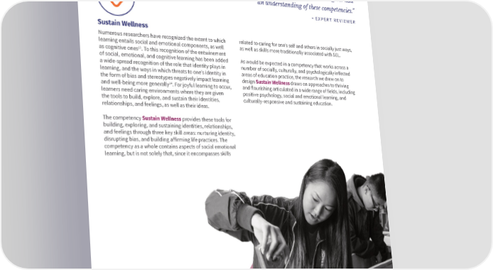 RESEARCH OVERVIEW BY COMPETENCY During my 昀椀rst read of the framework, I kept thinking what a di昀昀erence we would see in the world if every teacher, student, and caregiver had an understanding of these competencies.” - EXPERT REVIEWER Sustain Wellness Numerous researchers have recognized the extent to which related to caring for one’s self and others in socially just ways, learning entails social and emotional components, as well as well as skills more traditionally associated with SEL. 13 as cognitive ones . To this recognition of the entwinement of social, emotional, and cognitive learning has been added As would be expected in a competency that works across a a wide-spread recognition of the role that identity plays in number of socially, culturally, and psychologically inflected learning, and the ways in which threats to one’s identity in areas of education practice, the research we drew on to the form of bias and stereotypes negatively impact learning design Sustain Wellness draws on approaches to thriving 14 and well-being more generally . For joyful learning to occur, and flourishing articulated in a wide range of fields, including learners need caring environments where they are given positive psychology, social and emotional learning, and the tools to build, explore, and sustain their identities, culturally-responsive and sustaining education. relationships, and feelings, as well as their ideas. The competency Sustain Wellness provides these tools for building, exploring, and sustaining identities, relationships, and feelings through three key skill areas: nurturing identity, disrupting bias, and building a昀昀irming life practices. The competency as a whole contains aspects of social emotional learning, but is not solely that, since it encompasses skills 13 Immordino-Yang, et al. 2018 14 Nagaoka, 2015 8