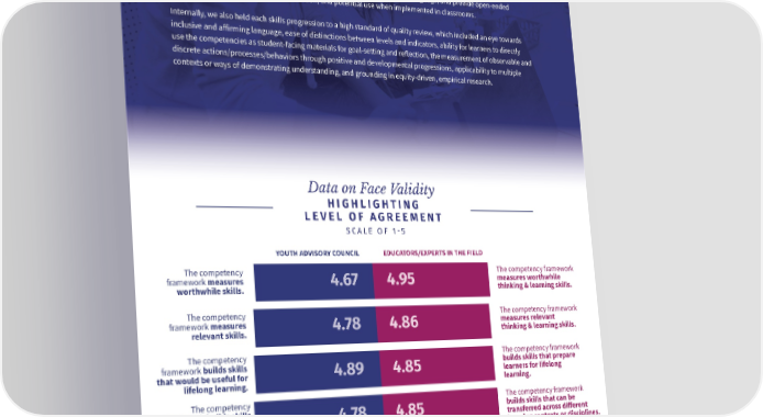 INSIGHTS cross the review process, we asked educators, young people, and subject matter experts to respond to face validity survey items based on their initial impressions of the competencies as a whole, Amake suggestions for improvement, including around the clarity of language, and provide open-ended comments on language, bias/representation, and potential use when implemented in classrooms. Internally, we also held each skills progression to a high standard of quality review, which included an eye towards inclusive and a昀昀irming language, ease of distinctions between levels and indicators, ability for learners to directly use the competencies as student-facing materials for goal-setting and reflection, the measurement of observable and discrete actions/processes/behaviors through positive and developmental progressions, applicability to multiple contexts or ways of demonstrating understanding, and grounding in equity-driven, empirical research. Data on Face Validity HIGHLIGHTING LEVEL OF AGREEMENT SCALE OF 1-5 YOUTH ADVISORY COUNCIL EDUCATORS/EXPERTS IN THE FIELD The competency The competency framework framework measures 4.67 4.95 measures worthwhile worthwhile skills. thinking & learning skills. The competency The competency framework framework measures 4.78 4.86 measures relevant relevant skills. thinking & learning skills. The competency The competency framework framework builds skills 4.89 4.85 builds skills that prepare that would be useful for learners for lifelong lifelong learning. learning. The competency The competency framework framework builds skills 4.78 4.85 builds skills that can be that can be used across transferred across di昀昀erent di昀昀erent subjects. learning contexts or disciplines. The competency The competency framework framework builds skills builds skills that support that develop the whole 4.78 4.71 a whole-child approach to student, academically learning. and socially. 9