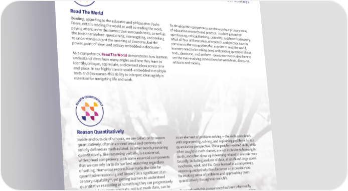 The framework is strongest in terms of thinking about students as actual people who are engaging in a quest to be well-rounded individuals and acquiring skills that will be useful to them (and society) post K-12 education.” - EXPERT REVIEWER Read The World Reading, according to the educator and philosopher Paulo To develop this competency, we drew on four primary areas Friere, entails reading the world as well as reading the word, of education research and practice: student-generated paying attention to the context that surrounds texts, as well as questioning, critical thinking, criticality, and historical inquiry. the texts themselves: questioning, interrogating, and seeking What all four of these areas of research and practice have in to understand not just the meaning of discourse, but the common is the recognition that in order to read the world, 11 power, point of view, and artistry embedded in discourse . learners need to be asking deep and probing questions about texts, discourse, and artifacts - questions that enable them to As a competency, Read The World demonstrates how learners see the ever-evolving connections between texts, discourse, understand ideas from many angles and how they learn to artifacts and society. identify, critique, appreciate, and connect ideas across time and place. In our highly literate world–embedded in multiple texts and discourses–this ability to interpret ideas agilely is essential for navigating life and work. Reason Quantitatively Inside and outside of schools, we are called on to reason as an element of problem-solving — the skills associated quantitatively, o昀琀en in content areas and contexts not with representing, solving, and explaining problems from a strictly defined as math-related. In other words, reasoning quantitative perspective. These problem-related skills, while quantitatively, like reasoning verbally, is a universal, o昀琀en taught in math classes, are not exclusive to learning in widespread competency, with some essential components math, and o昀琀en show up in learning related to analysis more that we can rely on to do our best reasoning regardless broadly, including analysis of data, at small and large scales of setting. Numerous reports have made the case for in schools, work, and life. Once learned as a competency, quantitative reasoning and literacy as a significant 21st- reason quantitatively then becomes an accessible tool 12 century capability , yet getting learners to understand for making sense of problems and approaching them quantitative reasoning as something they can progressively quantitatively throughout one’s life. learn and do in many contexts, not just math class, can be tricky because many learners have never seen and worked Our work with this competency has been informed by with quantitative reasoning as a transferable competency research on quantitative reasoning and literacy, problem with wide-spread utility in daily life, as well as a range of solving in math and science education, math mindsets, and academic disciplines. emerging research on teaching data literacy in secondary and elementary schools. The competency Reason Quantitatively aims to address this gap in learners’ understanding of the transferability and viability of quantitative reasoning in many contexts by distilling quantitative reasoning down to its essence 11 Freire, 1985 12Steen, ed. 2001 7
