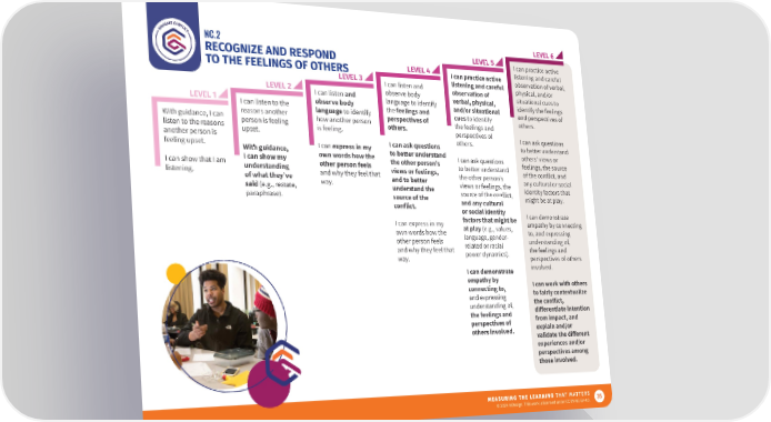 NC.2 LEVEL 6 RECOGNIZE AND RESPOND LEVEL 5 I can practice active TO THE FEELINGS OF OTHERS LEVEL 4 I can practice active listening and careful LEVEL 3 listening and careful observation of verbal, LEVEL 2 I can listen and observation of physical, and/or I can listen and observe body verbal, physical, situational cues to LEVEL 1 observe body language to identify and/or situational identify the feelings I can listen to the language to identify the feelings and cues to identify and perspectives of With guidance, I can reasons another how another person perspectives of the feelings and others. listen to the reasons person is feeling is feeling. others. perspectives of another person is upset. others. I can ask questions feeling upset. I can express in my I can ask questions to better understand With guidance, own words how the to better understand I can ask questions others’ views or I can show that I am I can show my other person feels the other person’s to better understand feelings, the source listening. understanding and why they feel that views or feelings, the other person’s of the conflict, and of what they’ve way. and to better views or feelings, the any cultural or social said (e.g., restate, understand the source of the conflict, identity factors that paraphrase). source of the and any cultural might be at play. conflict. or social identity factors that might be I can demonstrate I can express in my at play (e.g., values, empathy by connecting own words how the language, gender- to, and expressing other person feels related or racial understanding of, and why they feel that power dynamics). the feelings and way. perspectives of others I can demonstrate involved. empathy by I can work with others connecting to, to fairly contextualize and expressing the conflict, understanding of, di昀昀erentiate intention the feelings and from impact, and perspectives of explain and/or others involved. validate the di昀昀erent experiences and/or perspectives among those involved. 35