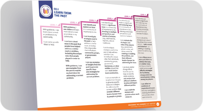 RW.4 LEVEL 6 LEARN FROM LEVEL 5 I can identify and THE PAST LEVEL 4 I can identify and explore a significant LEVEL 3 explore a significant and enduring issue LEVEL 2 I can identify and and enduring issue in a community of I can identify and explore a significant in a community of importance to me, LEVEL 1 explore an issue issue in a community importance to me, drawing on multiple With guidance, I in a community of of importance to me, drawing on multiple perspectives and With guidance, I can can notice and learn importance to me. drawing on multiple perspectives and sources of wisdom. learn about a need more about a need perspectives and sources of wisdom. or problem in my or problem in my I can investigate sources of wisdom I can evaluate the community. community. strategies used in (e.g., oral histories, I can evaluate the strategies and roles of the past to help legends, cultural strategies and key players from across I can come up with I can learn about address a similar traditions). roles of key players sectors — both current ideas to help. ways in the past that issue, including (e.g., government, and historical — in people have helped the unique roles I can investigate private sector, and creating or enabling address a similar that individuals, strategies used in the citizen sector) in power for addressing need or problem, community groups, past to help address creating or enabling the issue. including the unique or government a similar issue, the problem, and roles that people played. including the unique their di昀昀erent I can critique one or played in order to roles that individuals, levels of power for more past e昀昀orts to help. I can use examples community groups, addressing the issue. address this issue, or insights from the government, or a similar issue, With guidance, I can past to generate businesses, or other I can study similar to help me identify use examples from specific ideas entities played that change e昀昀orts viable solutions and the past to explain and strategies for were most and/or from the past to e昀昀ective strategies my best ideas for addressing the least constructive. help me identify for facilitating addressing a current current problem. viable solutions, change and/or for problem. I can use examples or and analyze how consciousness-raising insights from the past di昀昀erent solutions among key players. to generate specific involve and impact ideas and strategies di昀昀erent parties. I can reflect on for addressing the cautionary or current problem that I can credit the inspirational lessons consider di昀昀erent thinkers and from my investigation, levels of power held activists whose work crediting the thinkers by people or groups. I drew on. and activists whose work I drew on. 41