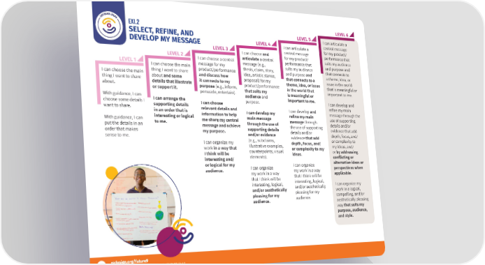 EXI.2 LEVEL 6 SELECT, REFINE, AND LEVEL 5 I can articulate a DEVELOP MY MESSAGE LEVEL 4 I can articulate a central message LEVEL 3 central message for my product/ LEVEL 2 I can choose and for my product/ performance that I can choose a central articulate a central performance that suits my audience LEVEL 1 message for my message (e.g., suits my audience and purpose and I can choose the main product/performance thesis, claim, story, and purpose and that connects to I can choose the main thing I want to share and discuss how idea, artistic stance, that connects to a a theme, idea, or thing I want to share about and some it connects to my proposal) for my theme, idea, or issue issue in the world about. details that illustrate purpose (e.g., inform, product/performance in the world that that is meaningful or or support it. persuade, entertain). that suits my is meaningful or important to me. With guidance, I can audience and important to me. choose some details I I can arrange the I can choose purpose. I can develop and want to share. supporting details relevant details and I can develop and refine my main in an order that is information to help I can develop my refine my main message through the With guidance, I can interesting or logical me share my central main message message through use of supporting put the details in an to me. message and achieve through the use of the use of supporting details and/or order that makes my purpose. supporting details details and/or evidence that add sense to me. and/or evidence evidence that add depth, focus, and/ I can organize my (e.g., subclaims, depth, focus, and/ or complexity to work in a way that illustrative examples, or complexity to my my ideas, and/ I think will be counterpoints, visual ideas. or by addressing interesting and/ elements). conflicting or or logical for my I can organize alternative ideas or audience. I can organize my work in a way perspectives when my work in a way that I think will be applicable. that I think will be interesting, logical, interesting, logical, and/or aesthetically I can organize my and/or aesthetically pleasing for my work in a logical, pleasing for my audience. compelling, and/or audience. aesthetically pleasing way that suits my purpose, audience, and style. 24