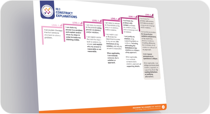 RQ.3 LEVEL 6 CONSTRUCT LEVEL 5 I can frame the EXPLANATIONS LEVEL 4 I can frame the problem with context, LEVEL 3 problem with and state my solution LEVEL 2 I can state my answer context, and state using precise language I can state my answer to the problem using my solution, using and/or notation. LEVEL 1 to the problem using precise vocabulary precise language and/ I can state my precise vocabulary and/or notation. or notation. I can justify my solution I can explain the steps answer to a problem and/or notation. for my particular that I or someone and explain and/or I can explain and/ I can justify my audience and purpose, else took to solve a show my steps in I can explain and/or or illustrate the solution using using supporting problem. order to make my illustrate the steps I steps I took to come supporting details or details or evidence, thinking visible. took to come to my to my answer, the evidence, including including addressing answer, and explain limitations of my addressing the the limitations of my why my answer is solution, and why my limitations of my solution or critiques of reasonable or not answer is reasonable. solution or critiques my approach. reasonable. When applicable, of my approach. I can respond I can evaluate When applicable, persuasively to someone else’s I can evaluate questions or critique. solution or someone else’s approach. solution, approach, or When applicable, I can supporting details. critique someone else’s solution, approach, or supporting details by naming limitations or justifying alternatives. 45