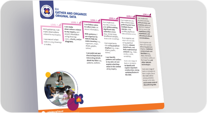 EI.4 LEVEL 6 GATHER AND ORGANIZE LEVEL 5 I can implement ORIGINAL DATA LEVEL 4 I can implement my my data collection LEVEL 3 data collection plan, with precision and LEVEL 2 I can implement gathering data from accuracy, gathering I can follow a plan my data collection multiple diverse data from multiple LEVEL 1 to collect data and plan while avoiding sources, while diverse sources or I can make record information. significant data avoiding significant repetitions of the With guidance, I can observations related collection errors data collection errors. experiment, and make observations to my inquiry, and With guidance, I (e.g., missed steps, attending to ethical related to my inquiry. record information can organize my insu昀昀icient samples, I can organize and considerations. using drawings, data to help me inaccurate recording). represent my data I can record what I notes, charts, and/or make meaning (e.g., using graphical I can organize and notice using drawings diagrams. organizers, maps, I can organize my displays, relevant represent my data or notes. charts, graphs, data using graphical digital tools, and sets using graphical tables). displays (e.g., maps, basic mathematical displays, statistical charts, graphs, analysis (e.g., mean, analysis tools and I can point out and tables). median, mode, functions (e.g., discuss important or variability). slope, intercept, interesting details I can identify correlation coe昀昀icient about my data (e.g., patterns and outliers I can use a range of for linear fits), and patterns, outliers). in my data set and tools or strategies other relevant explain what they to identify and technologies. mean in the context explain important of my inquiry. relationships among I can use a range of variables/factors in tools or strategies to the data. form insights about the relationships among variables/ factors in the data, and to make sense of disconfirming data. 20