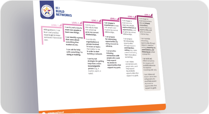 BC.1 LEVEL 6 BUILD LEVEL 5 I can engage in NETWORKS LEVEL 4 I can engage in experiences to form LEVEL 3 experiences to new and diverse LEVEL 2 I can engage in meet new people, connections, I can try out a experiences to meet explore interests or explore interests or LEVEL 1 new way to meet new people and/ opportunities, and/ opportunities, and I can try out a way to new people or or grow my current or grow my current grow my current With guidance, I can meet new people or grow my current relationships. relationships. relationships. learn and practice learn new things. relationships. ways to get to know I can prepare I can prepare I can maximize someone I have never I can identify a group I can identify for networking for networking networking met. that cares about organizations or opportunities by opportunities opportunities through something that groups involved doing research in through research research, intention- matters to me. in issues or topics advance. and intention- setting, preparing my I can ask for help that matter to me, setting (e.g., make contributions, and in order to start I can practice a new connection, following up (where with something I’m building a network. initiating learn more about appropriate). doing or making. connections with something). I can try out people who could I can build and strategies for getting help expand I can initiate reflect on routines help from a more my access to connections with for engaging with knowledgeable opportunities that people who could available resources person (e.g., a support my goals. help expand for expert or teacher, a peer, a my access to knowledgeable help. tutor). opportunities that I can initiate and support my goals. sustain connections with people who could help expand my access to opportunities that support my goals. 8