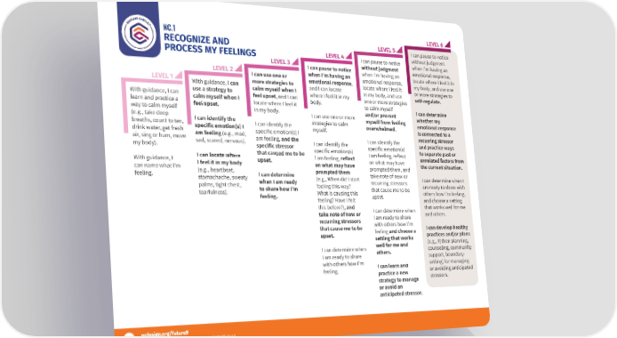 NC.1 LEVEL 6 RECOGNIZE AND LEVEL 5 I can pause to notice PROCESS MY FEELINGS LEVEL 4 I can pause to notice without judgment LEVEL 3 without judgment when I’m having an LEVEL 2 I can pause to notice when I’m having an emotional response, I can use one or when I’m having an emotional response, locate where I feel it in LEVEL 1 more strategies to emotional response, locate where I feel it my body, and use one With guidance, I can calm myself when I and I can locate in my body, and use or more strategies to With guidance, I can use a strategy to feel upset, and I can where I feel it in my one or more strategies self-regulate. learn and practice a calm myself when I locate where I feel it body. to calm myself way to calm myself feel upset. in my body. and/or prevent I can determine (e.g., take deep I can use one or more myself from feeling whether my breaths, count to ten, I can identify the I can identify the strategies to calm overwhelmed. emotional response drink water, get fresh specific emotion(s) I specific emotion(s) I myself. is connected to a air, sing or hum, move am feeling (e.g., mad, am feeling, and the I can identify the recurring stressor my body). sad, scared, nervous). specific stressor I can identify the specific emotion(s) and practice ways that caused me to be specific emotion(s) I am feeling, reflect to separate past or With guidance, I I can locate where upset. I am feeling, reflect on what may have unrelated factors from can name what I’m I feel it in my body on what may have prompted them, and the current situation. feeling. (e.g., heartbeat, I can determine prompted them take note of new or stomachache, sweaty when I am ready (e.g., When did I start recurring stressors I can determine when I palms, tight chest, to share how I’m feeling this way? that cause me to be am ready to share with tearfulness). feeling. What is causing this upset. others how I’m feeling, feeling? Have I felt and choose a setting this before?), and I can determine when that works well for me take note of new or I am ready to share and others. recurring stressors with others how I’m that cause me to be feeling and choose a I can develop healthy upset. setting that works practices and/or plans well for me and (e.g., if/then planning, I can determine when others. counseling, community I am ready to share support, boundary- with others how I’m I can learn and setting) for managing feeling. practice a new or avoiding anticipated strategy to manage stressors. or avoid an anticipated stressor. 34