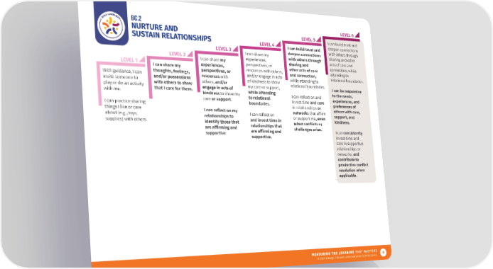 BC.2 LEVEL 6 NURTURE AND LEVEL 5 I can build trust and SUSTAIN RELATIONSHIPS LEVEL 4 I can build trust and deepen connections LEVEL 3 deepen connections with others through LEVEL 2 I can share my with others through sharing and other I can share my experiences, sharing and acts of care and LEVEL 1 experiences, perspectives, or other acts of care connection, while I can share my perspectives, or resources with others, and connection, attending to With guidance, I can thoughts, feelings, resources with and/or engage in acts while attending to relational boundaries. invite someone to and/or possessions others, and/or of kindness to show relational boundaries. play or do an activity with others to show engage in acts of my care or support, I can be responsive with me. that I care for them. kindness to show my while attending I can reflect on and to the needs, care or support. to relational invest time and care experiences, and I can practice sharing boundaries. in relationships or preferences of things I like or care I can reflect on my networks that a昀昀irm others with care, about (e.g., toys, relationships to I can reflect on or support me, even support, and supplies) with others. identify those that and invest time in when conflicts or kindness. are a昀昀irming and relationships that challenges arise. supportive. are a昀昀irming and I can consistently supportive. invest time and care in supportive relationships or networks, and contribute to productive conflict resolution when applicable. 9