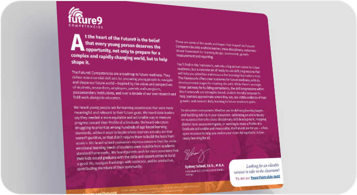 t the heart of the Future9 is the belief These are some of the needs and hopes that shaped the Future9 that every young person deserves the Competencies into a whole-learner, trans-disciplinary, outcomes- Aopportunity, not only to prepare for a driven framework for learning design, assessment, growth measurement and reporting. complex and rapidly changing world, but to help shape it. You’ll find in this framework, not only a big-picture vision for future readiness, but a concrete set of ready-to-use skill progressions that The Future9 Competencies are a roadmap to future readiness. They will help you prioritize and measure the learning that matters most. define nine essential skill sets for preparing young people to navigate The framework o昀昀ers clear outcomes for future readiness, with six and shape our future world – inspired by the voices and perspectives developmental stages for charting the path. While there’s no single, of students, researchers, employers, parents and caregivers, linear pathway for building competency, the skill progressions within postsecondary institutions, and over a decade of our own research and this framework use strengths-based, student-friendly language to field work alongside educators. help learners approximate where they are, see visible evidence of their growth, and connect daily learning to future-readiness goals. We heard young people ask for learning experiences that were more To educators everywhere: Whether you’re defining learning targets meaningful and relevant to their future goals. We heard state leaders and building rubrics in your classroom, calibrating an entire faculty say they needed a more equitable and actionable way to measure on success criteria for cross-disciplinary skill development, mapping progress toward their Profile of a Graduate. We heard educators district-level assessment goals, or working to make a Profile of a struggling to prioritize among hundreds of age-based learning Graduate actionable and measurable, the Future9 are for you – a free, standards, without ways to locate where learners actually are that open resource to help you realize your vision for equitable, future- weren’t punitive, or that didn’t require them to build the tools from ready learning for all. scratch. We heard school counselors express concerns that the socio- emotional learning needs of students were invisible from academic standard frameworks. We heard parents wish for more assurance that their kids would graduate with the skills and opportunities to build a good life, navigate hardships with resilience, and be productive, contributing members of their community. Sydney Schaef, Ed.D., M.B.A. LEAD ARCHITECT, FUTURE9 COMPETENCIES Looking for an editable reDesign version to take to the classroom? Try out our PowerPoint slide deck! © 2024 reDesign. This work is licensed under CC BY-NC-SA 4.0, a Creative Commons 2 Attribution-NonCommercial-ShareAlike 4.0 International license.