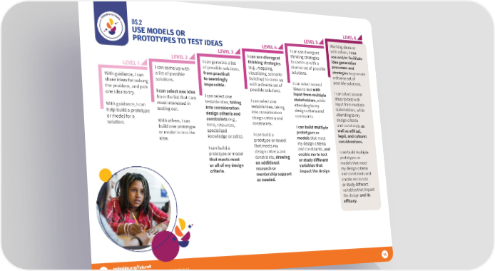 DS.2 LEVEL 6 USE MODELS OR LEVEL 5 Working alone or PROTOTYPES TO TEST IDEAS LEVEL 4 I can use divergent with others, I can LEVEL 3 thinking strategies use and/or facilitate LEVEL 2 I can use divergent to come up with a idea generation I can generate a list thinking strategies diverse set of possible processes and LEVEL 1 of possible solutions, (e.g., mapping, solutions. strategies to generate I can come up with from practical visualizing, scenario- a diverse set of With guidance, I can a list of possible to seemingly building) to come up I can select several possible solutions. share ideas for solving solutions. impossible. with a diverse set of ideas to test with the problem, and pick possible solutions. input from multiple I can select several one idea to try. I can select one idea I can select one stakeholders, while ideas to test with from the list that I am testable idea, taking I can select one attending to my input from multiple With guidance, I can most interested in into consideration testable idea, taking design criteria and stakeholders, while help build a prototype testing out. design criteria and into consideration constraints. attending to my or model for a constraints (e.g., design criteria and design criteria solution. With others, I can time, resources, constraints. I can build multiple and constraints as build one prototype specialized prototypes or well as ethical, or model to test the knowledge or skills). I can build a models that meet legal, and cultural idea. prototype or model my design criteria considerations. I can build a that meets my and constraints, and prototype or model design criteria and enable me to test I can build multiple that meets most constraints, drawing or study di昀昀erent prototypes or or all of my design on additional variables that models that meet criteria. research or impact the design. my design criteria mentorship support and constraints and as needed. enable me to test or study di昀昀erent variables that impact the design and its e昀昀icacy. 14 14