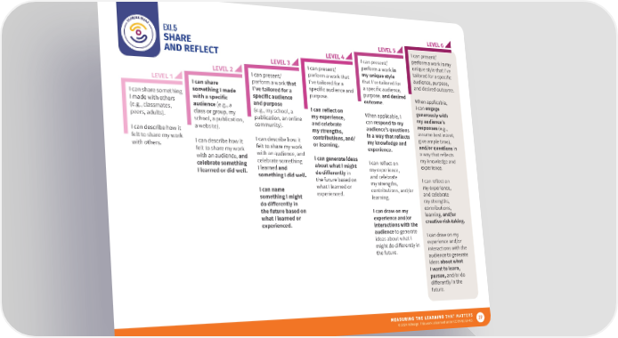 EXI.5 LEVEL 6 SHARE LEVEL 5 I can present/ AND REFLECT LEVEL 4 I can present/ perform a work in my LEVEL 3 perform a work in unique style that I’ve LEVEL 2 I can present/ my unique style tailored for a specific I can present/ perform a work that that I’ve tailored for audience, purpose, LEVEL 1 perform a work that I’ve tailored for a a specific audience, and desired outcome. I can share I’ve tailored for a specific audience and purpose, and desired I can share something something I made specific audience purpose. outcome. When applicable, I made with others with a specific and purpose I can engage (e.g., classmates, audience (e.g., a (e.g., my school, a I can reflect on When applicable, I generously with peers, adults). class or group, my publication, an online my experience, can respond to my my audience’s school, a publication, community). and celebrate audience’s questions responses (e.g., I can describe how it a website). my strengths, in a way that reflects assume best intent, felt to share my work I can describe how it contributions, and/ my knowledge and give ample time), with others. I can describe how it felt to share my work or learning. experience. and/or questions in felt to share my work with an audience, and a way that reflects with an audience, and celebrate something I can generate ideas I can reflect on my knowledge and celebrate something I learned and about what I might my experience, experience. I learned or did well. something I did well. do di昀昀erently in and celebrate the future based on my strengths, I can reflect on I can name what I learned or contributions, and/or my experience, something I might experienced. learning. and celebrate do di昀昀erently in my strengths, the future based on I can draw on my contributions, what I learned or experience and/or learning, and/or experienced. interactions with the creative risk-taking. audience to generate I can draw on my ideas about what I experience and/or might do di昀昀erently in interactions with the the future. audience to generate ideas about what I want to learn, pursue, and/or do di昀昀erently in the future. 27