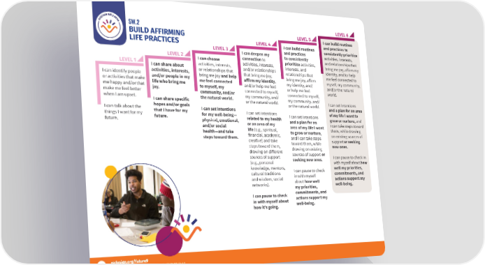 SW.2 LEVEL 6 BUILD AFFIRMING LEVEL 5 I can build routines LIFE PRACTICES LEVEL 4 I can build routines and practices to LEVEL 3 and practices consistently prioritize LEVEL 2 I can deepen my to consistently activities, interests, I can choose connection to prioritize activities, and relationships that LEVEL 1 activities, interests, activities, interests, interests, and bring me joy, a昀昀irm my I can share about or relationships that and/or relationships relationships that identity, and/or help I can identify people activities, interests, bring me joy and help that bring me joy, bring me joy, a昀昀irm me feel connected to or activities that make and/or people in my me feel connected a昀昀irm my identity, my identity, and/ myself, my community, me happy and/or that life who bring me to myself, my and/or help me feel or help me feel and/or the natural make me feel better joy. community, and/or connected to myself, connected to myself, world. when I am upset. the natural world. my community, and/ my community, and/ I can share specific or the natural world. or the natural world. I can set intentions I can talk about the hopes and/or goals I can set intentions and a plan for an area things I want for my that I have for my for my well-being— I can set intentions I can set intentions of my life I want to future. future. physical, emotional, related to my health and a plan for an grow or nurture, and and/or social or an area of my area of my life I want I can take steps toward health—and take life (e.g., spiritual, to grow or nurture, them, while drawing steps toward them. financial, academic, and I can take steps on existing sources of creative) and take toward them, while support or seeking steps toward them, drawing on existing new ones. drawing on di昀昀erent sources of support or sources of support seeking new ones. I can pause to check in (e.g., personal with myself about how knowledge, mentors, I can pause to check well my priorities, cultural traditions in with myself commitments, and and wisdom, social about how well actions support my networks). my priorities, well-being. I can pause to check commitments, and in with myself about actions support my how it’s going. well-being. 48