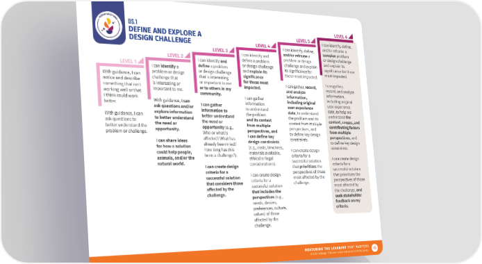 DS.1 LEVEL 6 DEFINE AND EXPLORE A LEVEL 5 I can identify, define, DESIGN CHALLENGE LEVEL 4 I can identify, define, and/or reframe a LEVEL 3 and/or reframe a complex problem LEVEL 2 I can identify and problem or design or design challenge I can identify and define a problem challenge and explain and explain its LEVEL 1 define a problem or design challenge its significance for significance for those I can identify a or design challenge and explain its those most impacted. most impacted. With guidance, I can problem or design that is interesting significance notice and describe challenge that or important to me for those most I can gather, record, I can gather, something that isn’t is interesting or or to others in my impacted. and analyze record, and analyze working well or that important to me. community. information, information, I think could work I can gather including original including original better. With guidance, I can I can gather information user experience user experience ask questions and/or information to to understand data, to understand data, to help me With guidance, I can explore information better understand the problem the problem and its understand the ask questions to to better understand the need or and its context context from multiple context, causes, and better understand the the need or opportunity (e.g., from multiple perspectives, and contributing factors problem or challenge. opportunity. Who or what is perspectives, and to define key design from multiple a昀昀ected? What has I can define key constraints. perspectives, and I can share ideas already been tried? design constraints to define key design for how a solution How long has this (e.g., costs, timelines, I can create design constraints. could help people, been a challenge?). materials available, criteria for a animals, and/or the ethical or legal successful solution I can create design natural world. I can create design considerations). that prioritizes the criteria for a criteria for a perspectives of those successful solution successful solution I can create design most a昀昀ected by the that prioritizes the that considers those criteria for a challenge. perspectives of those a昀昀ected by the successful solution most a昀昀ected by challenge. that includes the the challenge, and perspectives (e.g., seek stakeholder needs, desires, feedback on my preferences, culture, criteria. values) of those a昀昀ected by the challenge. 13