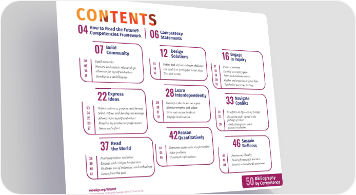 04How to Read the Future9 06Competency Competencies Framework Statements 07 Build Design Engage Community 12 Solutions 16in Inquiry 08 Build networks 13 De昀椀ne and explore a design challenge 17 Frame a question 09 Nurture and sustain relationships 14 Use models or prototypes to test ideas 18 Develop an inquiry plan 10 Advocate for myself and others 15 Test and iterate 19 Select and evaluate sources 11 Develop as a multilingual 20 Gather and organize original data 21 Synthesize sources or 昀椀ndings Learn 22Express 28Interdependently Navigate Ideas 29 Develop a plan to pursue a goal 33Con昀氀ict 23 De昀椀ne audience, purpose, and format 30 Monitor progress and adjust 24 Select, re昀椀ne, and develop my message 31 Give and receive feedback 34 Recognize and process my feelings 25 Advocate for myself and others 32 Engage in discussion 35 Recognize and respond to the 26 Finalize my product or performance feelings of others 27 Share and re昀氀ect 36 Apply strategies to work toward resolution 42Reason 37Read Quantitatively Sustain the World 43 Represent mathematical information 46Wellness 38 Find inspiration and ideas 44 Solve problems 39 Engage and critique perspectives 45 Construct explanations 47 Nurture my identity 40 Evaluate use of techniques and technology 48 Build a昀케rming life practices 41 Learn from the past 49 Develop intercultural competence 50Bibliography by Competency 33
