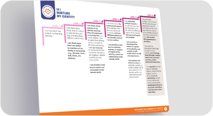 SW.1 LEVEL 6 NURTURE LEVEL 5 I can articulate MY IDENTITY LEVEL 4 I can articulate multiple aspects of my LEVEL 3 multiple aspects of identity, how they are LEVEL 2 I can share about the my identity, how they expressed in my life I can share about most central aspects are expressed in my and relationships, and LEVEL 1 aspects of my of my identity, how life, and how di昀昀erent how di昀昀erent aspects I can share some identity and how they are expressed aspects of my identity of my identity intersect I can say what I like things that are unique they are expressed in my life, and how intersect and impact and have evolved over to do in my free time, or special about me in my daily life (e.g., di昀昀erent aspects of one another. time with pivotal and why. (e.g., interests, likes, I’m an athlete, I love my identity connect life experiences or dislikes, experiences). to spend time playing to one another. I can examine a decisions. I can share ways sports; I am part of I can practice a new stereotype that I can examine that I am similar the Deaf community, way to celebrate, relates to aspects stereotypes that relate to members of my I use sign language express, or explore of my identity, and to aspects of my family or community to communicate with an aspect of my counter it with identity and challenge (e.g., the way I look, my family members; I identity, and/or my truths about my life them through creative talk, think, act, am religious, I attend relationship to the and experiences. expression, personal believe). worship services natural world. pursuits, and/or every week). I can practice and personal interactions. reflect on ways to I can practice a new celebrate, express, or I can regularly practice way to explore my further explore one or ways to celebrate, connection to the more aspects of my express, and/or further natural world. identity, and/or my explore aspects relationship to the of my identity in natural world. community, as well as my relationship to the natural world, adapting practices as my needs, identities, and interests evolve over time. 47